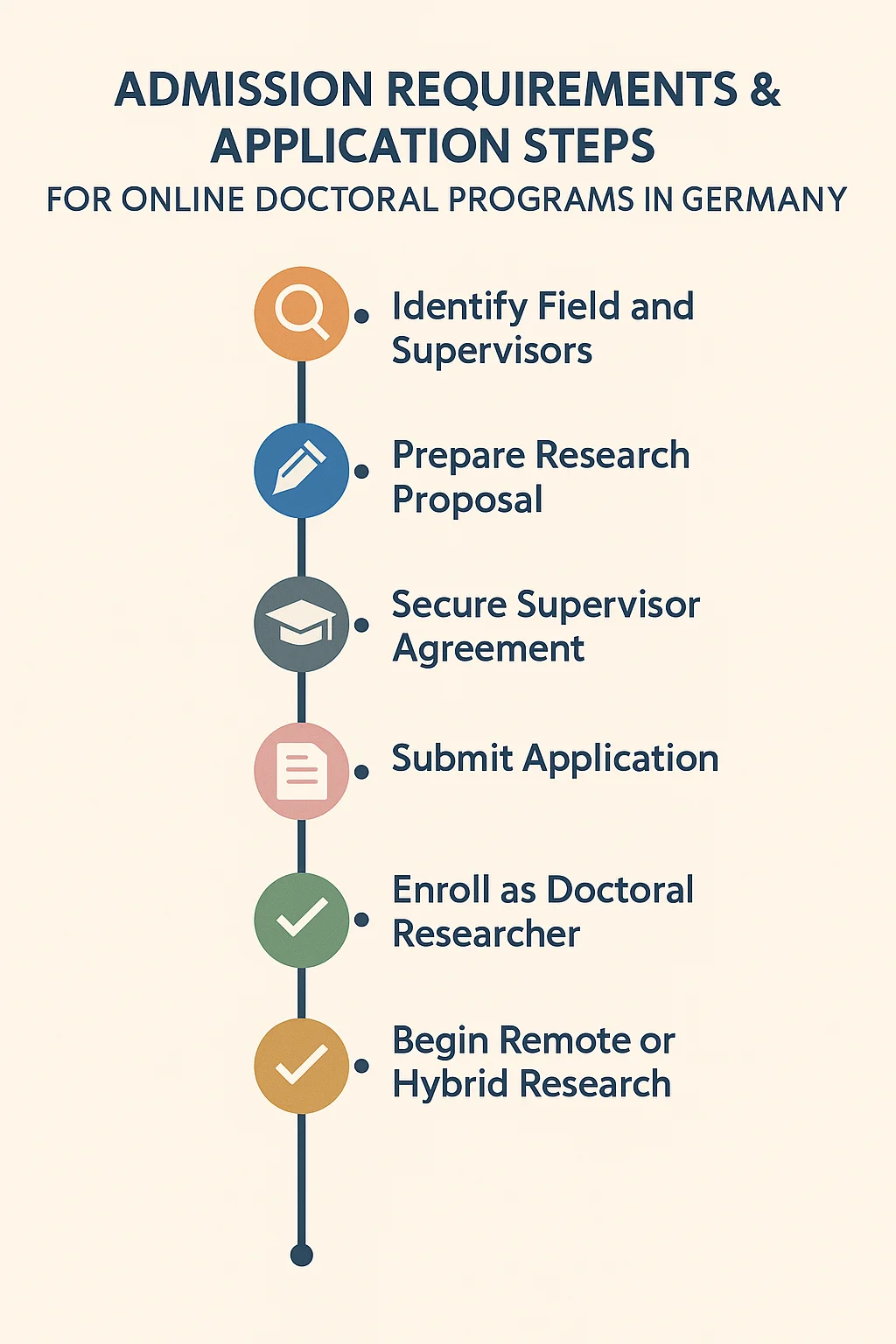 If you are planning to enroll in any doctoral program in Germany, first you should shortlist and identify the right university that fits your academic goals, you should need to prepare strong research proposal and go through the program specific criteria. Though the admission requirements in online doctoral programs in Germany may vary by university, the program you are going to enroll but the overall process follows a clear and predictable structure.